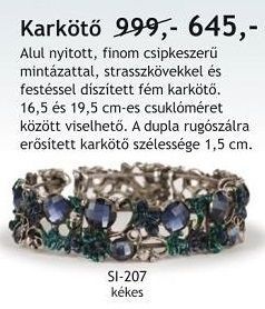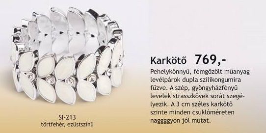 Pehelykönnyű, fémgőzölt műanyag levélpárok dupla szilikongumire fűzve, A szép, gyöngyházfényű levelek strasszkövek sorát szegélyezik. A 3 cm széles karkötő szinte minden csuklóméreten nagyon jól mutat.