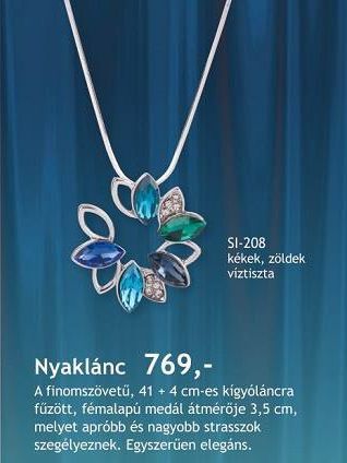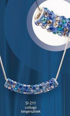 Temérdek apró kövável a szépen ívelt, 5 cm kosszú, cső formájú, fém középdísz vonzza a tekintetet. A csillogó "kékség" straszköveinek elrednezése egyedi. Hagyományos kígyóláncra 42+5 cm hosszúságú.
