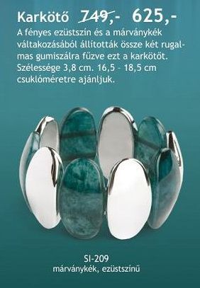 A fényes ezüstszín és márványkék változásából állították össze két rugalmas gumiszálra fűzve ezt a karkötőt. Szélessége 3,8 cm. 16,5 cm-18,5 cm csuklóméretre ajánljuk.